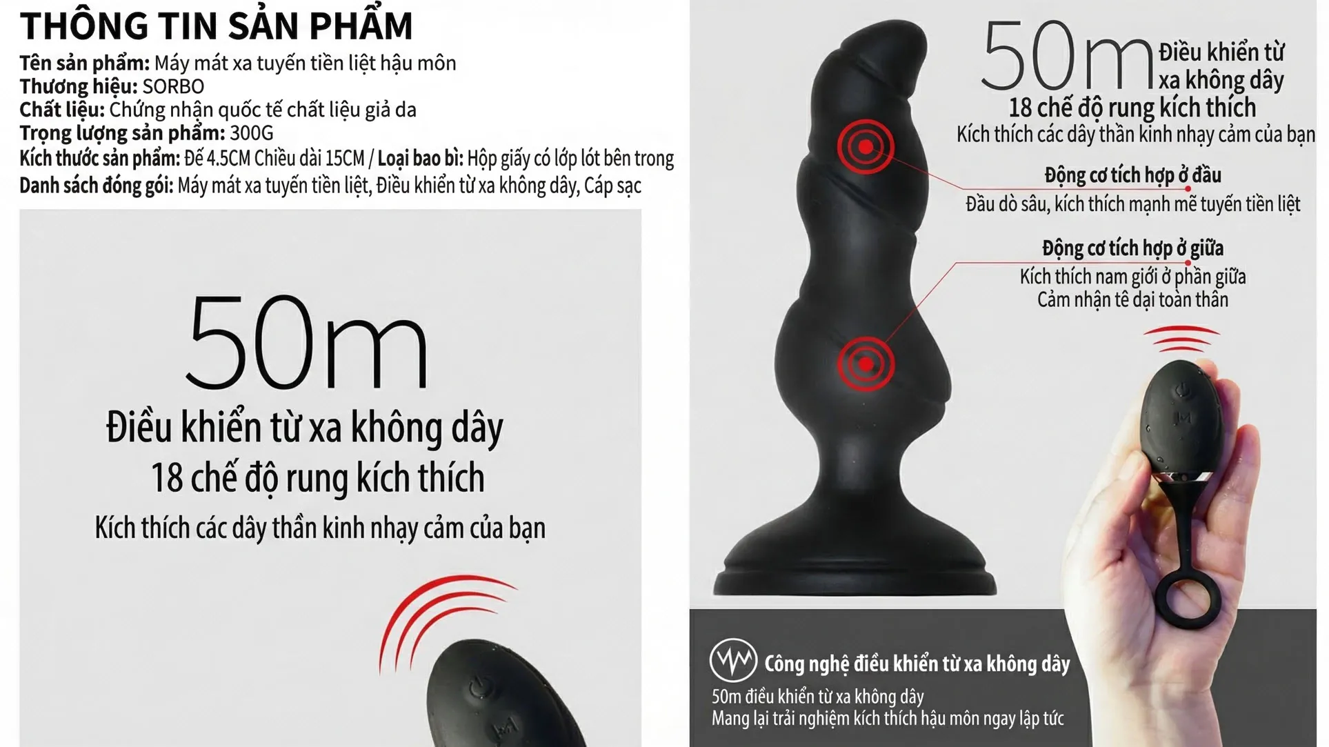 Điểm nổi bật giúp SORBO khác biệt là thiết kế tích hợp remote điều khiển từ xa không dây 5m – tính năng thường chỉ thấy ở sản phẩm cao cấp 3–5 triệu, nhưng SORBO mang lại ở mức giá 1.490.000đ. Đây là thiết bị duy nhất trong danh mục massage tuyến tiền liệt có remote điều khiển riêng biệt.
