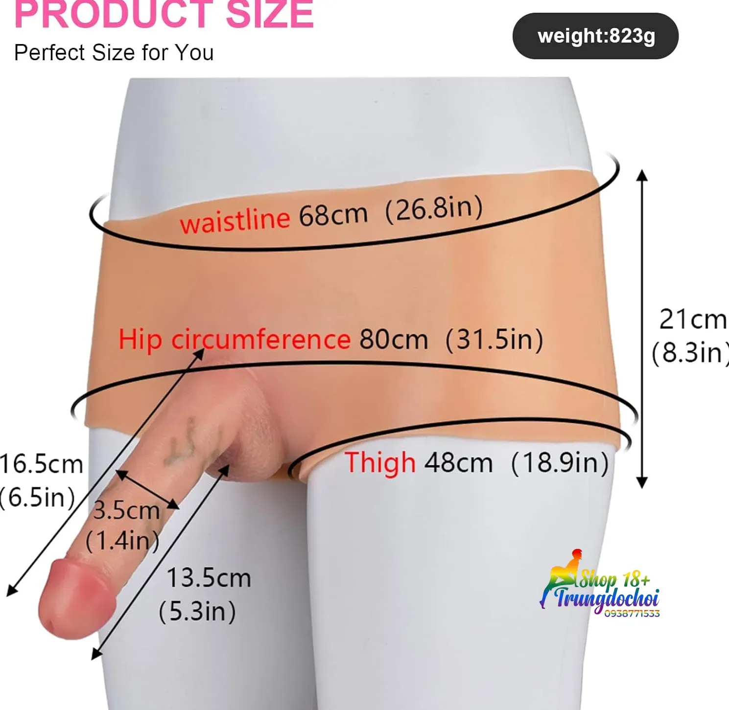 - Kích thước dương vật: Dài 16.5 cm (Tổng) - Dài thân 13.5 cm - Đường kính 3.5 cm