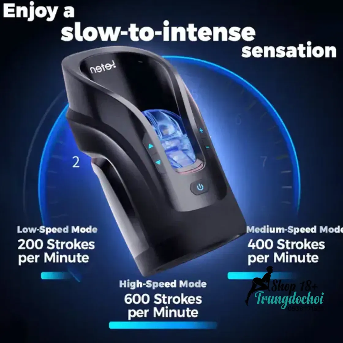 - Tốc độ 600 nhịp/phút cực mạnh – Chế độ tốc độ cao thực sự ấn tượng, tạo cảm giác kích thích dồn dập. Người có nhu cầu cao sẽ rất hài lòng với sức mạnh này.