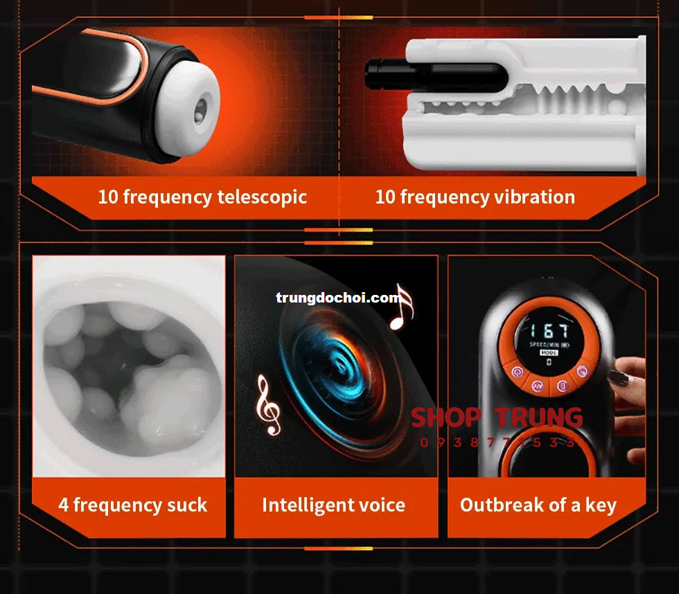 Tính năng : 10 chế độ rung thụt, 4 chế độ hút bú mút, có nhiệt độ 42 độ, có màn hình LCD,