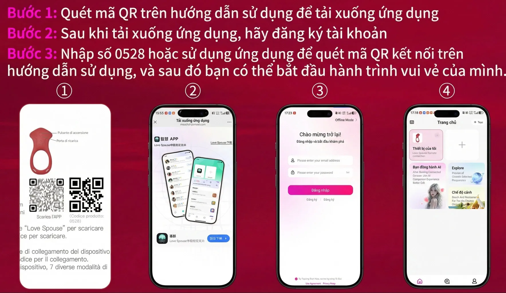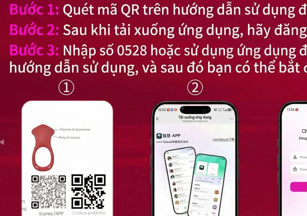 Bước 1 — Tải App & kết nối: Quét mã QR trong hộp để tải App Love Spouse (iOS/Android). Đăng ký tài khoản, bật Bluetooth và kết nối thiết bị. Mời bạn đời vào cùng tài khoản app để trao quyền điều khiển từ xa.