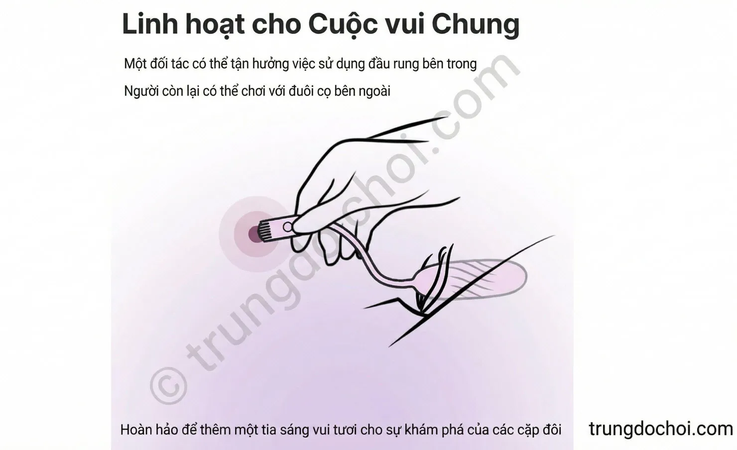 Bước 3 — Chọn đầu phù hợp mục đích: Đầu bullet hướng vào âm vật hoặc điểm G để kích thích tập trung. Đuôi chổi cọ dùng để massage nhẹ vùng da ngoài, ngực, đùi trong, hoặc để đối tác điều khiển từ app trong khi bạn cảm nhận.