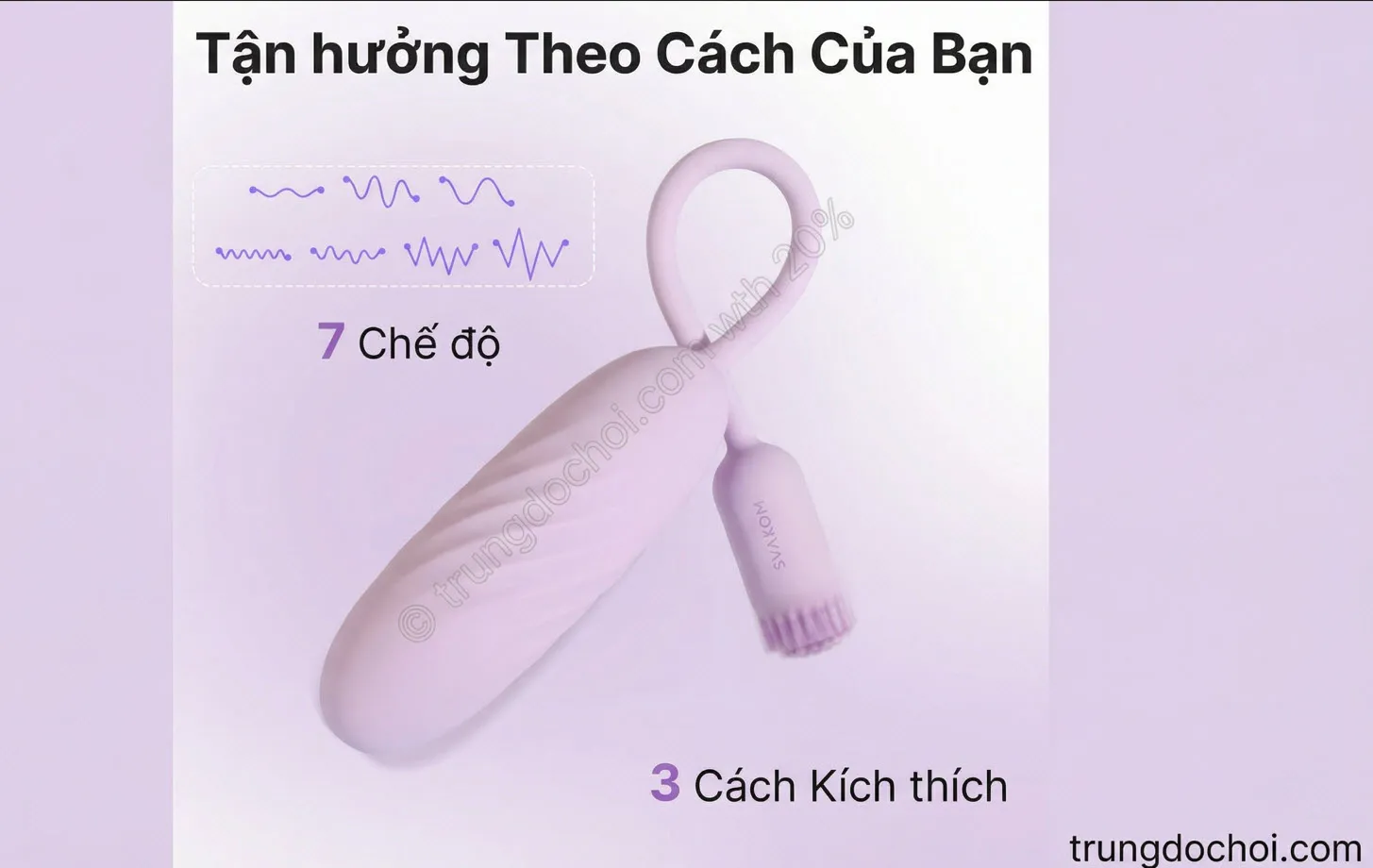 Bước 2 — Kích hoạt & chọn chế độ: Giữ nút nguồn 3 giây để bật. Nhấn ngắn để chuyển trong 7 chế độ có sẵn. Hoặc kết nối Bluetooth — mở app Svakom/KooSync để truy cập toàn bộ tính năng.