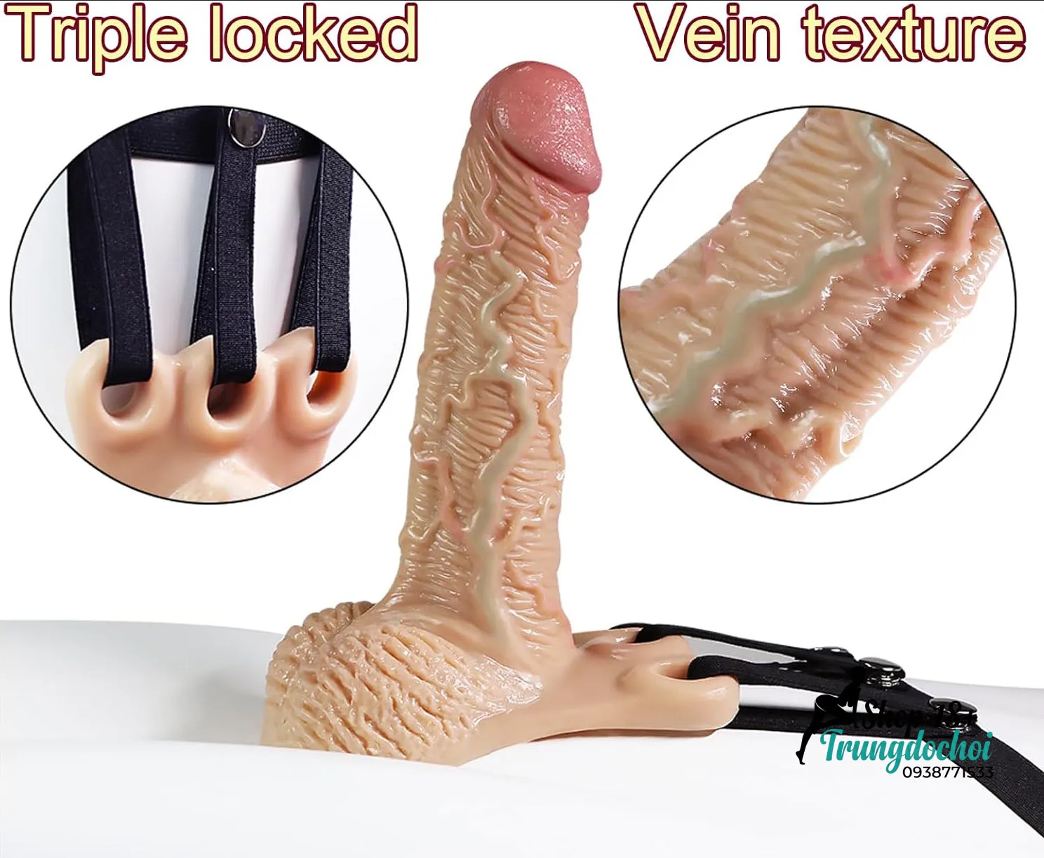 - Thiết kế rỗng ruột đa năng – Nam giới có thể đeo chồng lên dương vật thật để tăng kích thước/kéo dài thời gian. Nữ giới (Lesbian) sử dụng như Strapon thông thường. → 1 sản phẩm, nhiều công dụng.