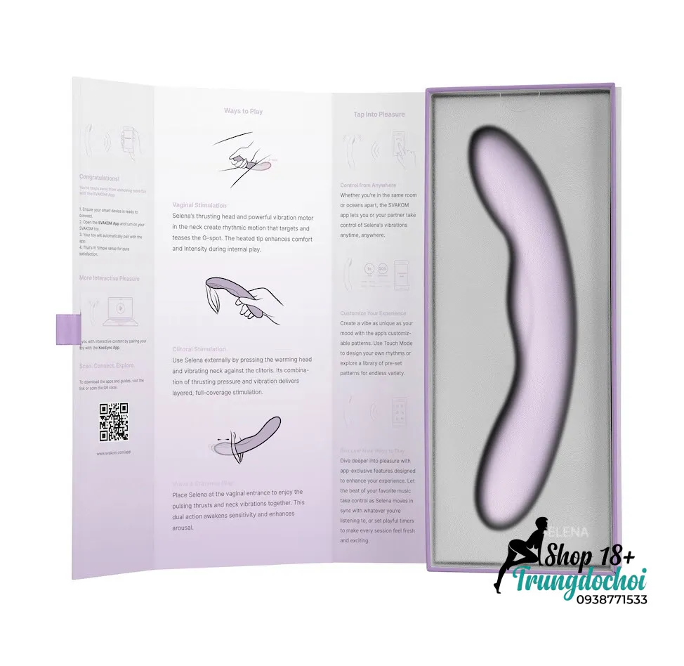 Dương vật giả Svakom Selena là sản phẩm cao cấp từ thương hiệu Mỹ với công nghệ rung thụt đồng thời, sưởi ấm 38°C và điều khiển qua app. Chất liệu silicone y tế an toàn, chống nước IPX7, giúp bạn khám phá khoái cảm đa chiều với 5 chế độ rung + 5 cường độ và 5 chế độ thụt độc đáo.